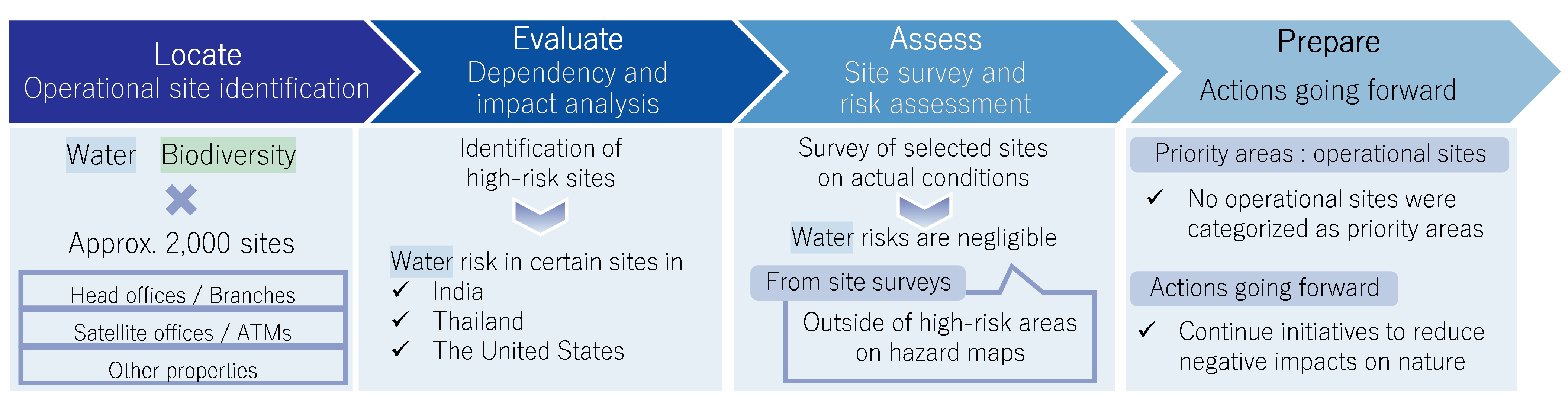 Mizuho has analyzed the natural capital dependencies and impacts at our directly operational sites. No operational sites were categorized as “priority areas” for high-risk interactions with nature. Nevertheless, we will continue to promote initiative sat our operational sites to mitigate impacts on nature.