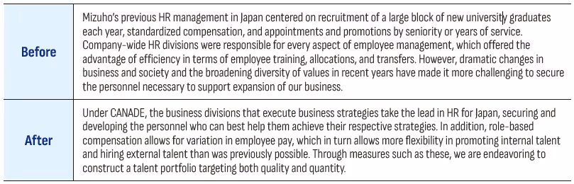 We believe that engaging in human capital management, guided by this CANADE framework, will connect the growth of individuals with business advancement, enhance Mizuho's capability to create value, and ultimately lead to the realization of our corporate identity.