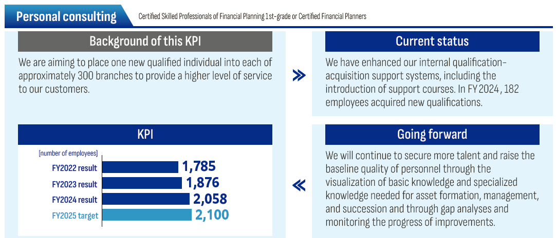 In our retail business in Japan, where we are focused on improving customer experience and supporting the doubling of asset-based income, we will review our digital, remote, and in-person approaches, move forward full digitalization of office procedures, and transform branches from places for administration into places for consultation. In light of the increasing importance of personnel who have knowledge and experience in face-to-face consulting and who are capable of supporting asset formation, management, and succession in a customer-oriented manner, we are putting emphasis on personnel development and have set a KPI for number of employees with personal consulting qualifications.