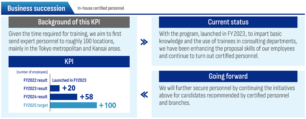 The corporate business, where we are aiming to enhance the competitiveness of Japanese companies, calls for the insight to delve deeper into industry trends and client needs and the creativity to design growth narratives with corporate clients. We are focusing in particular on the area of business succession, which requires specialized knowledge and practical experience. We have set a KPI for the number of in-house certified personnel who can support business succession and are strategically assigning personnel to this area. Similarly, in the area of support for startups/innovative companies, we have set a KPI for the number of in-house certified personnel in order to systematically develop personnel with experience in providing support in leading-edge technology fields and expertise in responding to the needs of companies at different stages of growth.