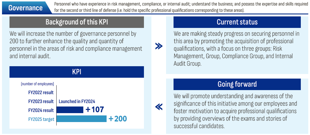 One of the priority areas of the medium-term business plan is maintaining stable business operations, which support our growth strategies and corporate foundations, and by extension all that Mizuho represents. With Mizuho being called on to implement deeper and more sophisticated governance, securing expert personnel in the areas of risk and compliance management and internal audit—the second and third lines of defense—is becoming increasingly important, and we have set the enhancement of these areas as a KPI.