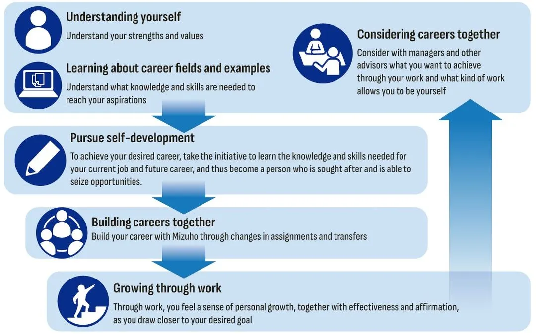 Mizuho promotes Career Development Management as a way for each employee to achieve the career that's right for them. Career Development Management is a mechanism that encourages our employees to achieve their aims through a cycle of understanding yourself, learning about career fields and examples, considering careers together, pursuing self-development, building careers together, and growing through work. In FY2024, we created the Funds for Learning and the Funds for Qualifications to further support employees engaged in self-development. Additionally, to provide more opportunities to build careers together, we expanded the scope and roll out of the Job Challenge Program to all of our employees. The Job Challenge Program allows them to apply for positions of their choice even in the absence of an internal job posting. Through these initiatives, our employees are steadily building careers that align with their individual aspirations.