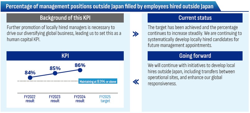We have set priority-focus areas within our business portfolio in line with our target business models and have set KPIs for the talent who will drive the realization of growth strategies in these areas. Thanks to independent HR management by business divisions, we are making steady progress on securing talent in each area and reaching the KPIs. In FY2025, we will continue efforts to enhance in-house training systems and mid-career recruiting in order to secure the necessary talent to realize our business strategies.