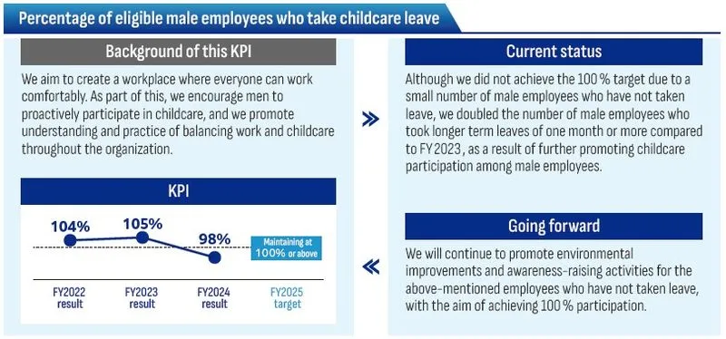 We hold information sessions for all employees and seminars led by outside experts for employees who have had children, those seeking childcare leave, and managers to learn about the significance of men taking childcare leave. We also send congratulatory emails to employees who have had children and their managers, among other initiatives to encourage male employees to participate in childcare. Additionally, we strive to address concerns that may dissuade men from taking advantage of childcare leave by introducing role models and sharing other information. To further encourage male employees to participate more in childcare, we recommend that male employees take one month or more of leave or leave of absence for childcare purposes in line with a policy established in July 2024 that male employees in general should take a minimum of 10 days for childcare. In conjunction with this, we hold information sessions to promote employee understanding, have established the Parental Leave Manual for Men, and have enhanced efforts to create environments in which men can confidently take leave for childcare by sharing information on leave status with department / branch managers. By encouraging men to take an active role in childcare, we aim to drive attitude and behavioral changes related to work style reforms, operational efficiency, and corporate culture transformation. This, in turn, helps foster workplaces where everyone can achieve a career that aligns with their individual values and aspirations.
