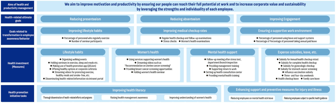 Mizuho will strategically promote health and productivity management, aiming to create an environment in which a diverse range of employees can work in a lively manner and to leverage the strengths and personalities of all employees by increasing their motivation and productivity, making them drivers of corporate value enhancement and sustainable growth.