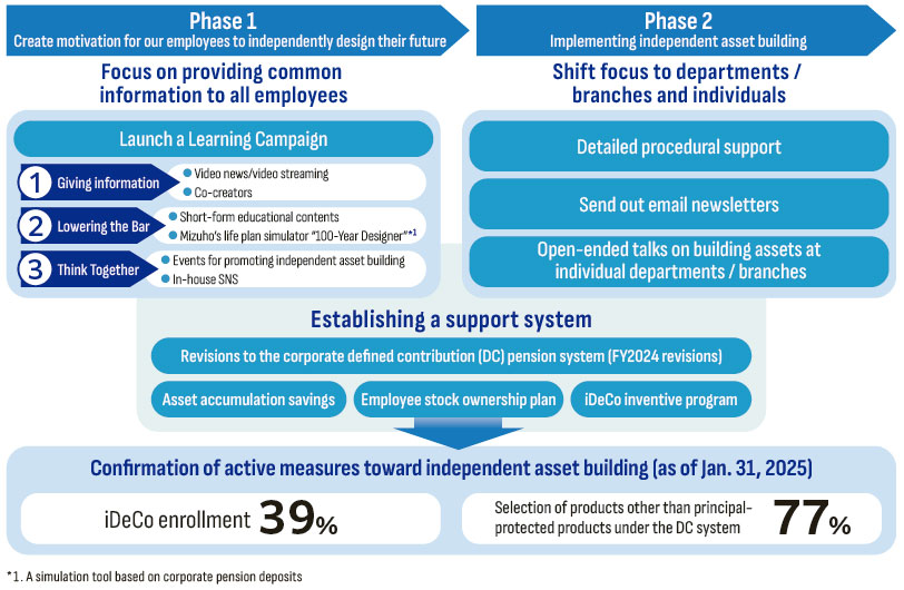 In addition to physical and mental health and wellness, Mizuho focuses on financial wellness, to eliminate our employees' future financial concerns so they can work with peace of mind. In FY2023, we concentrated on creating motivation for independent asset building through awareness-raising campaigns. In FY2024, we engaged with employees with significant interest in and understanding of building assets, with active encouragement from their departments and support tailored to their individual circumstances. We held talk events at branches and offices upon request and presented information based on the needs of motivated employees. We have confirmed that these initiatives have led to employees taking actual steps toward self-directed asset formation. We will continue to measure the effectiveness of these efforts while pursuing greater financial wellness for our employees.
